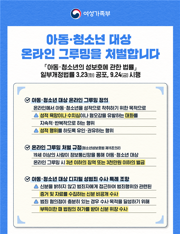 여성가족부(장관 정영애)는 아동·청소년을 성적으로 착취하기 위해 유인·권유하는 그루밍 행위를 처벌하는 등의 내용을 담은 「아동·청소년의 성보호에 관한 법률」(이하 ‘청소년성보호법’) 일부개정법률이 3월 23일(화) 공포되었다고 밝혔다. 이번 법 개정은 텔레그램 엔(n)번방 디지털 성범죄 사건을 계기로 관계부처 합동으로 마련한 ‘디지털 성범죄 근절 대책(’20.4월)‘에 담긴 아동·청소년 대상 디지털 성범죄 보호를 위한 입법조치의 일환이다.