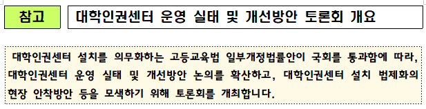 교육부는 “이번 토론회에서 제시된 다양한 의견을 수렴하여 대학인권센터 설치에 필요한 세부기준(안)을 마련하고, 관계기관 의견조회를 거쳐 하반기 중 대통령령을 개정할 예정이다.”라고 밝혔으며, 인권위는 “이번 토론회를 통해 대학인권센터의 위상과 역할 강화를 위한 풍부한 논의가 이뤄지길 기대하고, 대학인권센터의 역량강화를 위해 교육부와의 협력을 강화하겠다.”라고 밝혔다. 토론회 개요는 다음과 같다.