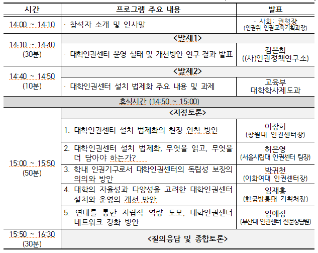 토론회의 세부일정과 진행방식은 다음과 같다. 먼저 김은희 인권정책연구소 상임연구원이 「대학인권센터 운영 실태 및 개선방안」연구결과를 발표한 후, 안웅환 교육부 대학학사제도과장은 대학인권센터 설치 법제화 주요 내용 및 과제를 소개한다. 이어 관련 전문가 및 대학 관계자들이 대학 인권센터의 활성화와 안정적 정착을 위한 다양한 방안 소개와 토론이 있었다.