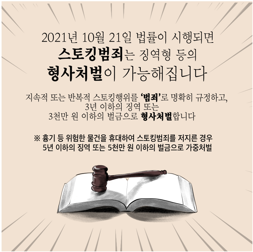 2021년 10월 21일 법률 시행 - 스토킹 범죄의 징역형 형사처벌 가능해져