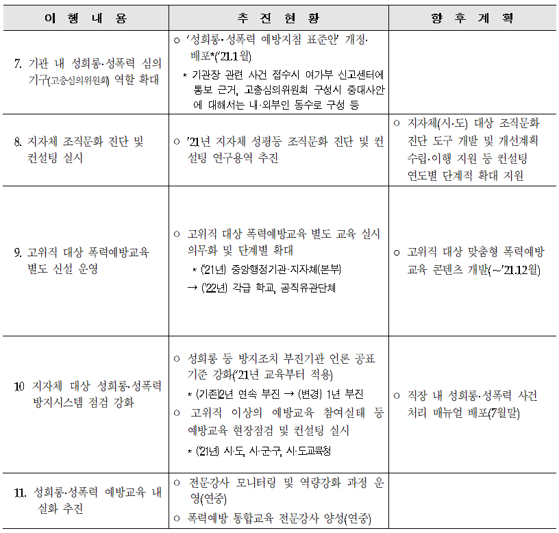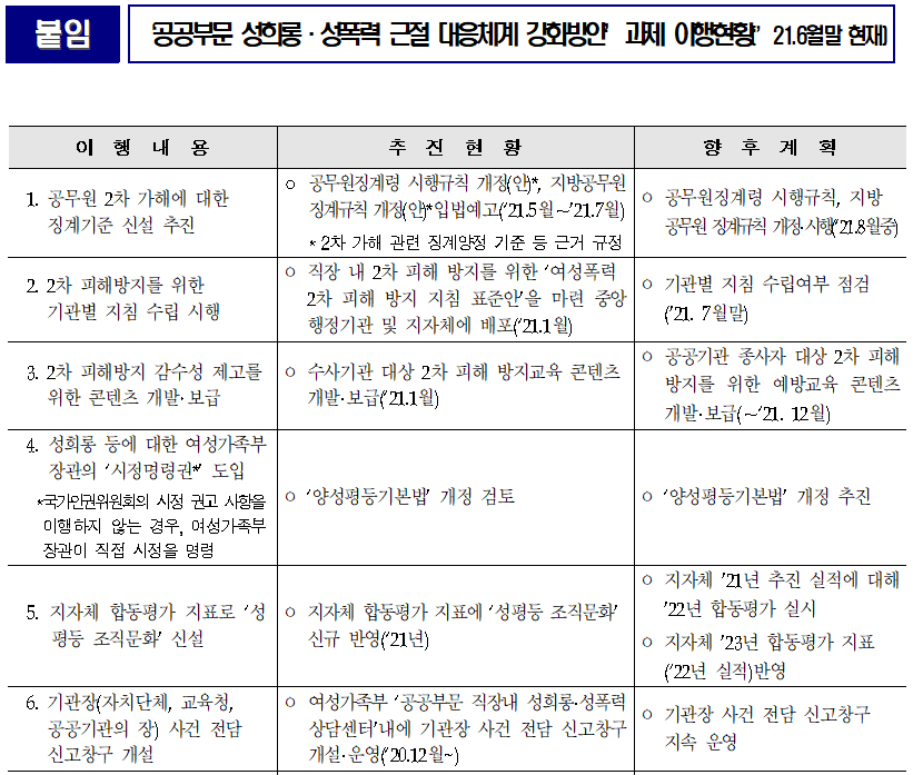 【붙임】‘공공부문 성희롱·성폭력 근절 대응체계 강화방안’ 과제 이행현황