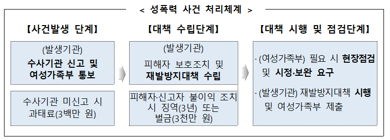 이러한 성폭력 사건 처리와 관련된 전반적인 제도 개선은 여성가족부가 지난해 마련한 「공공부문 성희롱·성폭력 근절 대응체계 강화 방안」의 일환으로 추진된 것이다. 이밖에도, 여성가족부는 ‘공공부문 직장 내 성희롱·성폭력 신고센터’ 내에 지방자치단체, 교육청, 공공기관의 장(이하, 기관장)의 성희롱‧성폭력 사건 전담 창구를 마련(’20.12월)하여 운영하고 있다.