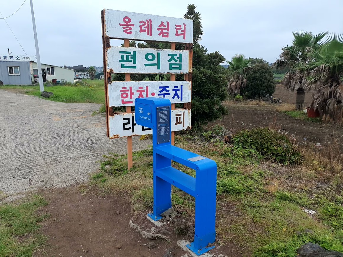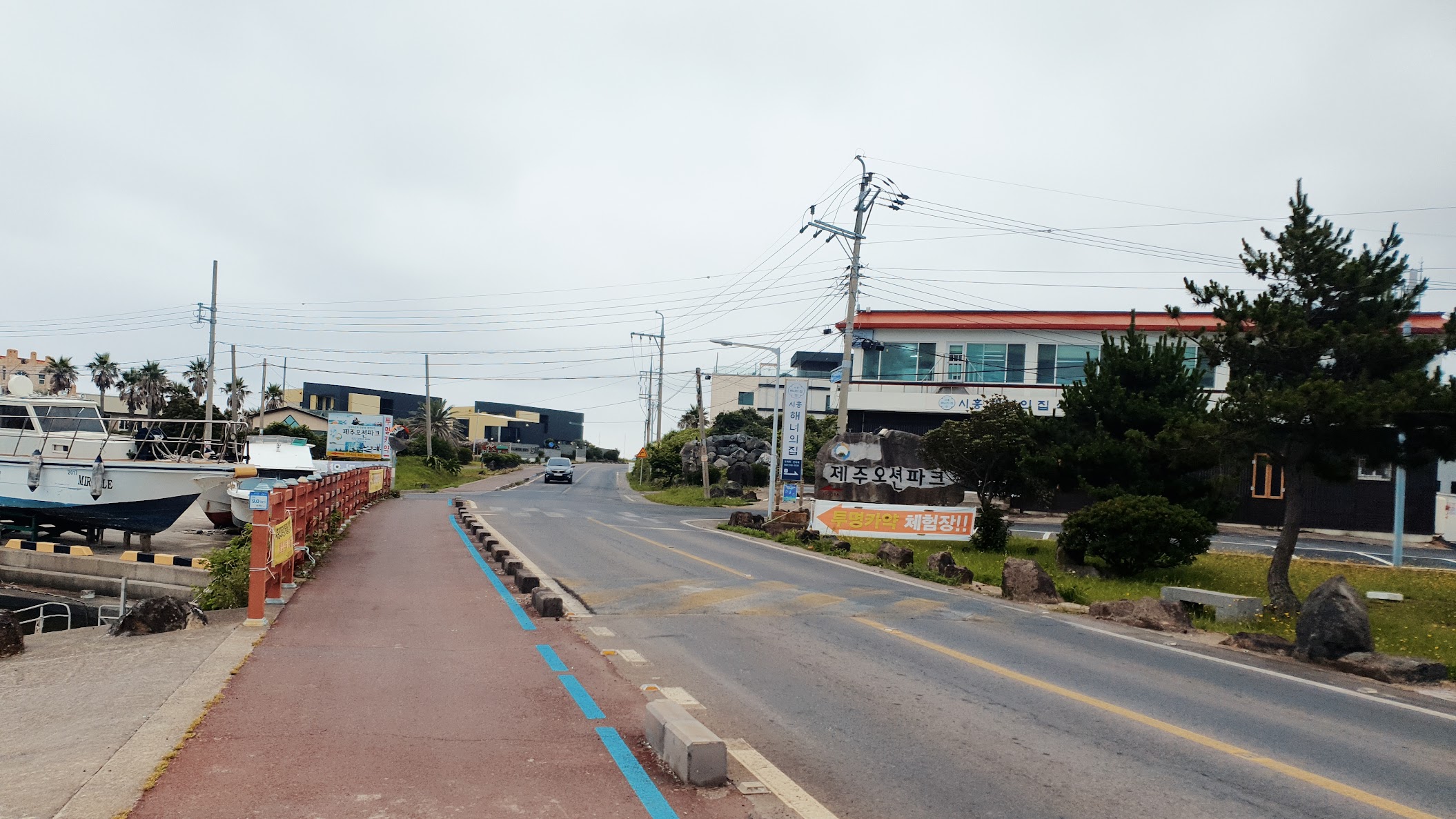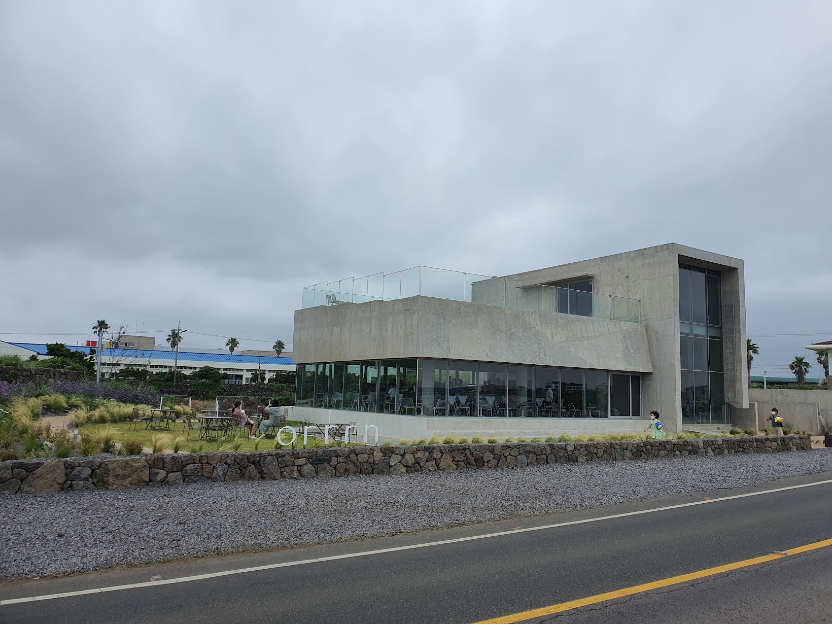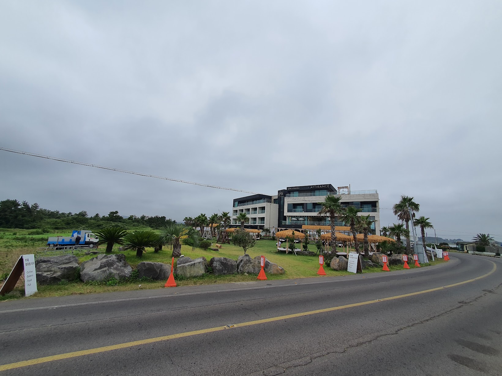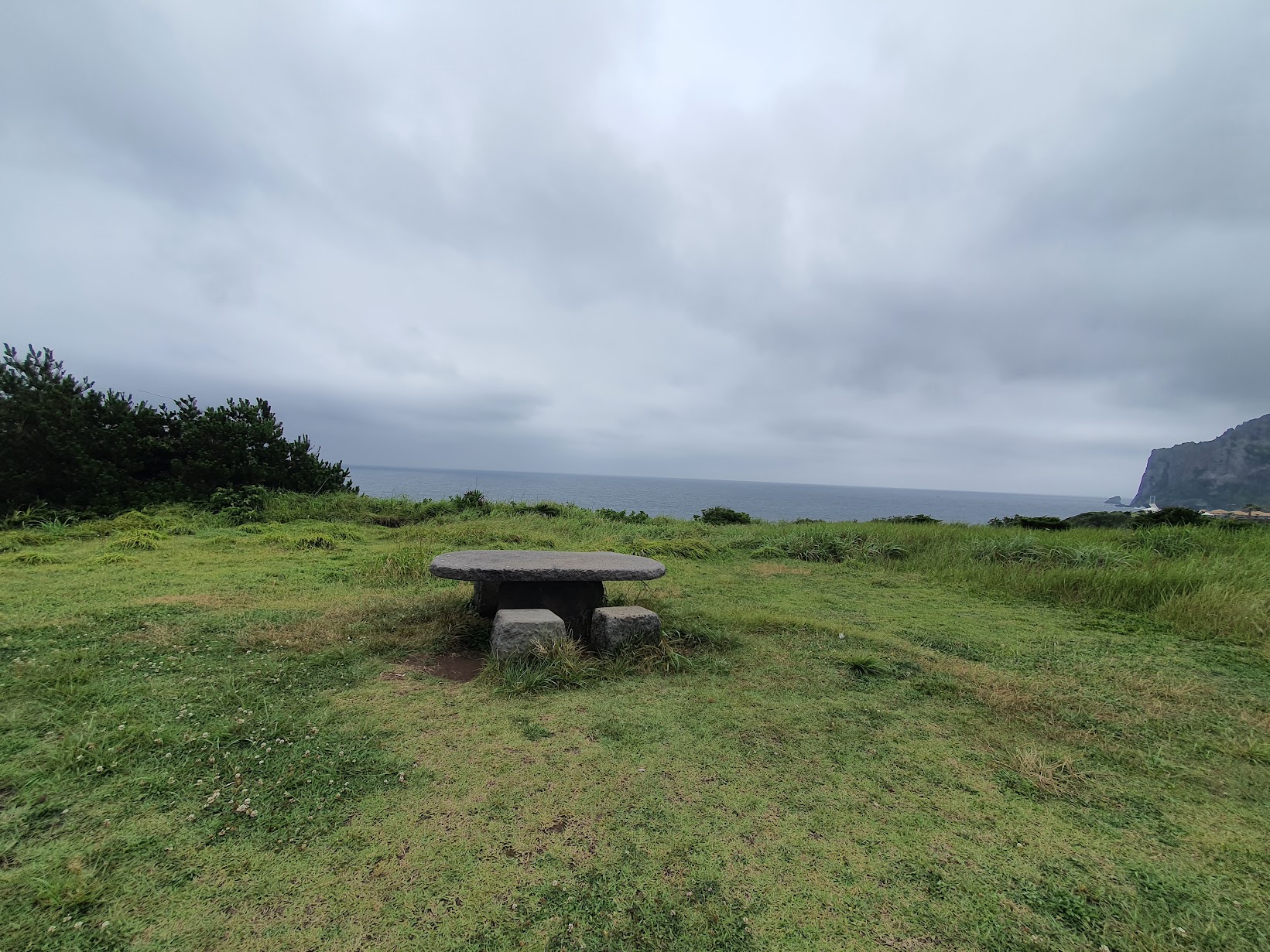 성산갑문 입구는 시작점에서 11.1km의 거리이다. 오전 9시 14분에 출발해서 오후 1시 52분에 갑문을 지나갔다. 갑문을 건너서 야트막한 언덕길로 들어서면 성산일출봉이 보이면서 아름다운 제주 동쪽의 바다가 펼쳐진다. 그래서 바다를 마주할 수 있도록 야트막한 언덕 위에 덩그러니 놓인 탁자는 마치 신들의 탁자로 느껴졌다. 멀리 더 클라우드 호텔이 보이는데, 확실치 않지만 운영이 중단된 것처럼 보였다. 다만 오르다 카페만큼은 코로나 상황에도 불구하고 사람들로 북적였다.