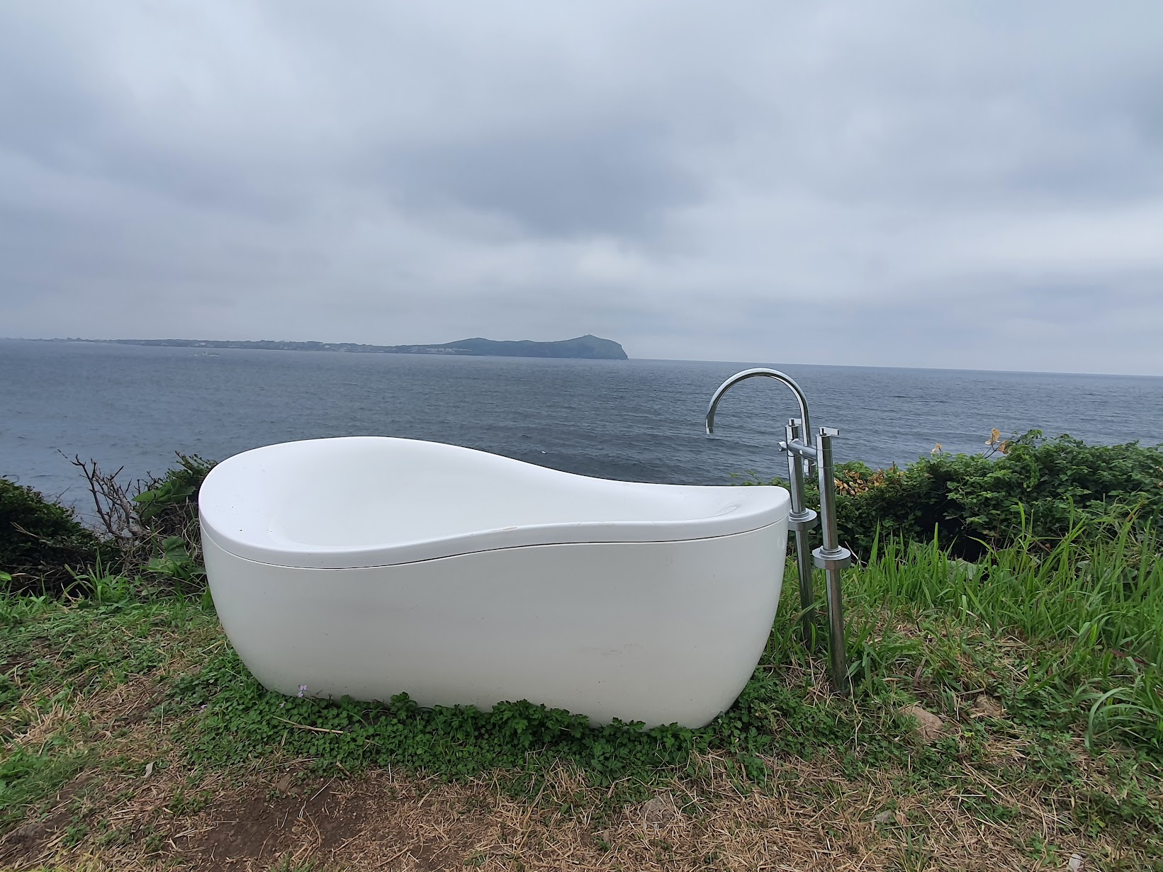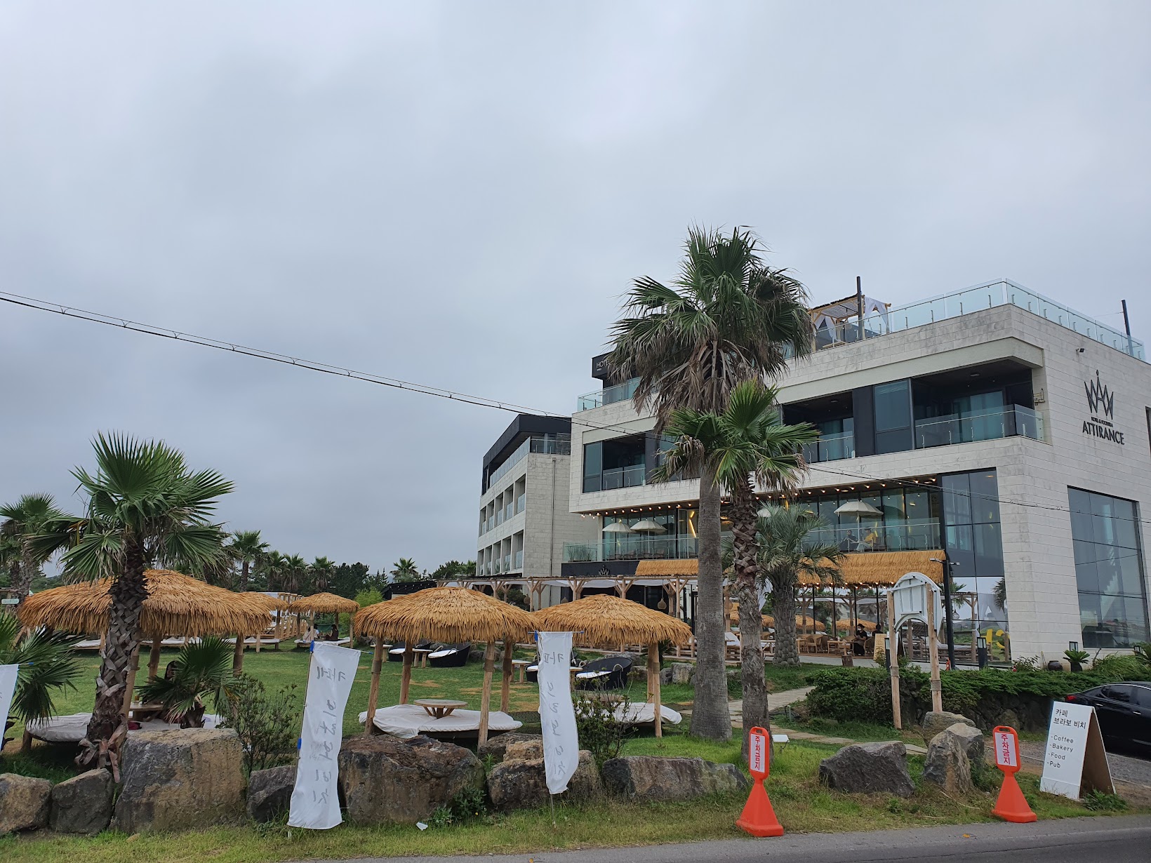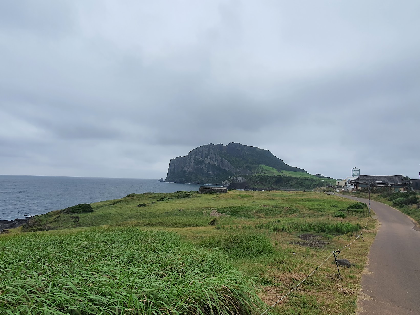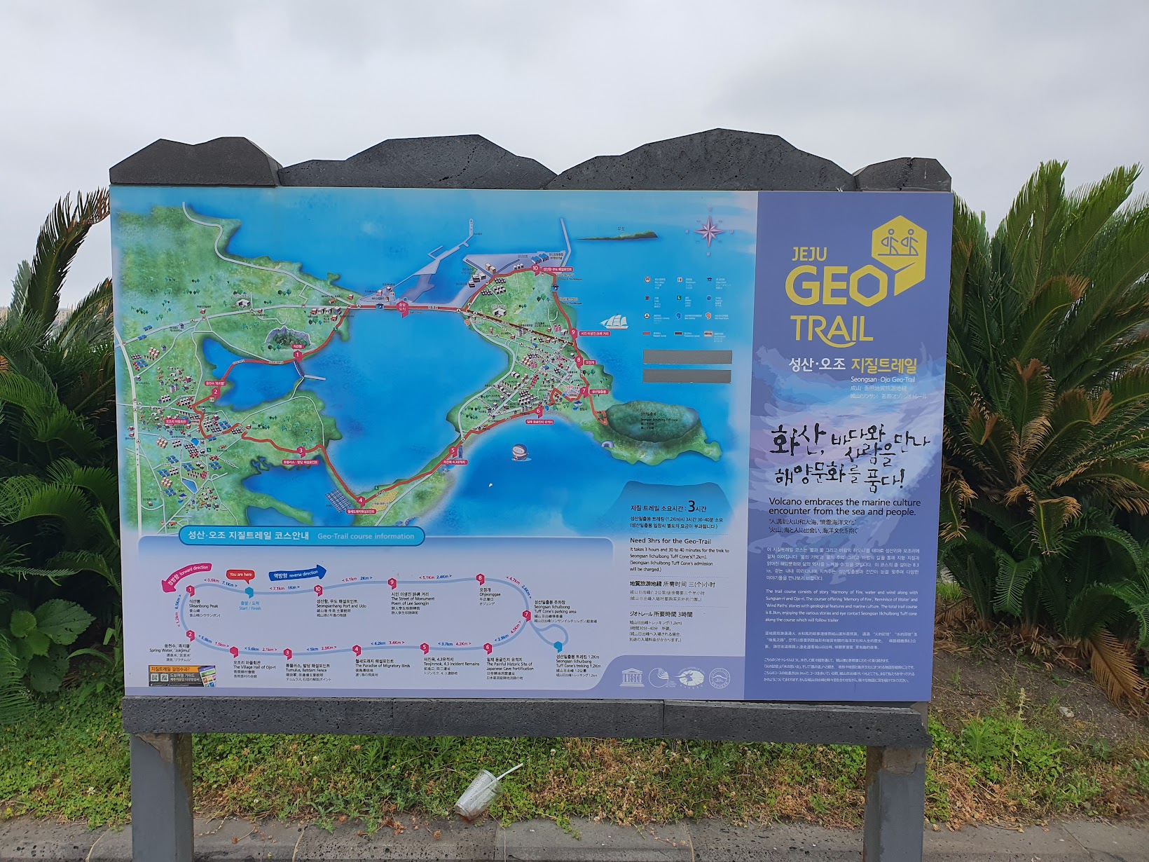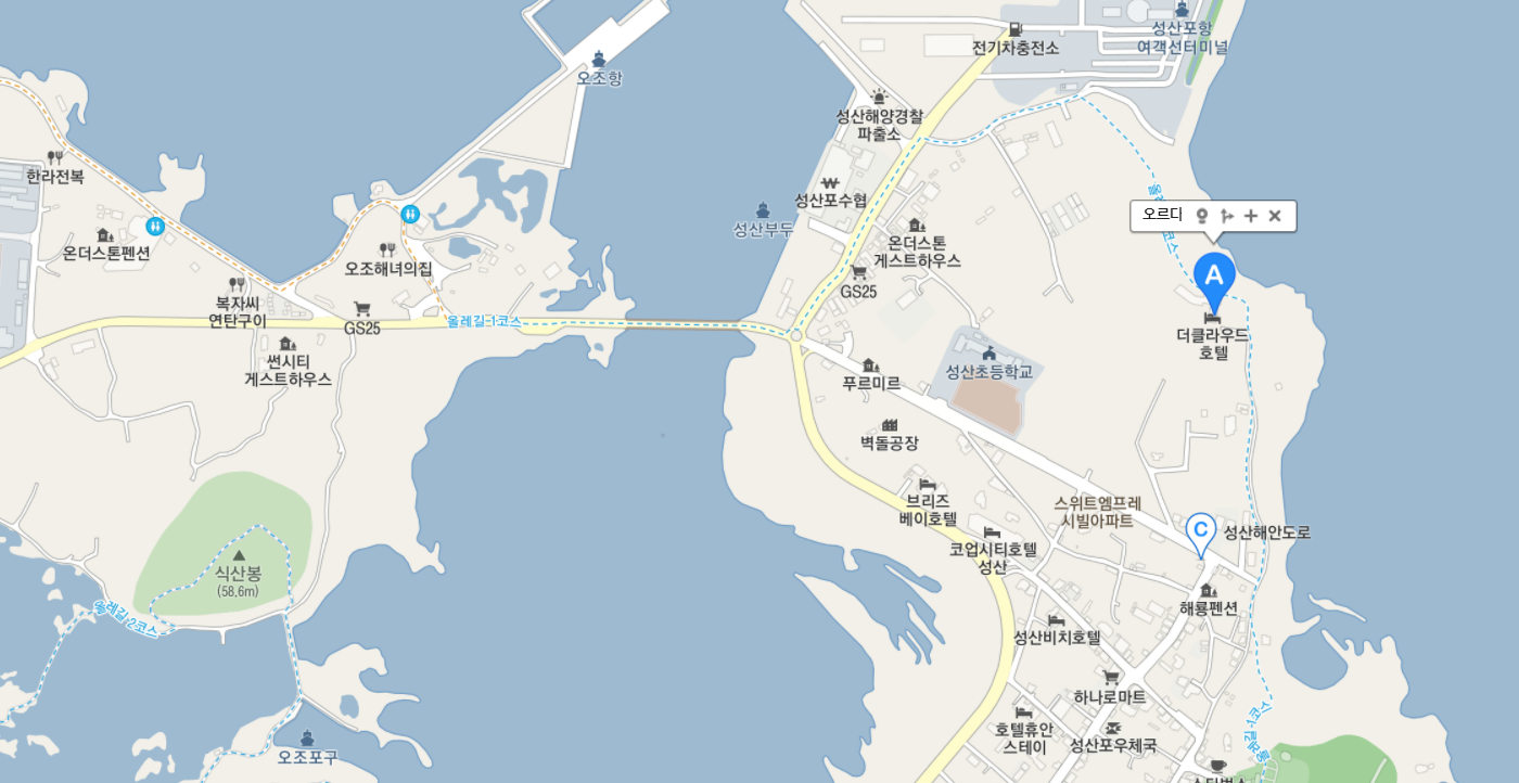 성산갑문 입구는 시작점에서 11.1km의 거리이다. 오전 9시 14분에 출발해서 오후 1시 52분에 갑문을 지나갔다. 갑문을 건너서 야트막한 언덕길로 들어서면 성산일출봉이 보이면서 아름다운 제주 동쪽의 바다가 펼쳐진다. 그래서 바다를 마주할 수 있도록 야트막한 언덕 위에 덩그러니 놓인 탁자는 마치 신들의 탁자로 느껴졌다. 멀리 더 클라우드 호텔이 보이는데, 확실치 않지만 운영이 중단된 것처럼 보였다. 다만 오르다 카페만큼은 코로나 상황에도 불구하고 사람들로 북적였다.
