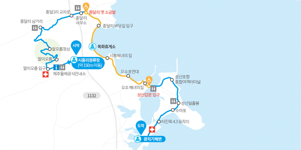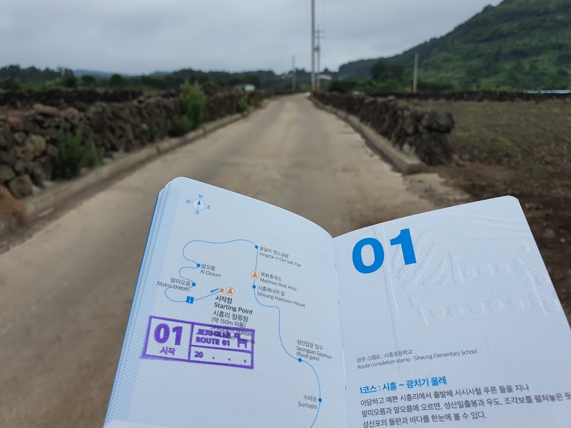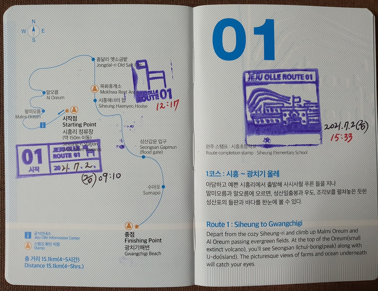제주올레의 첫번째 코스를 완주한 것은 2021년 7월 2일(금) 오후 3시 30분의 일이다. 올레에서 가장 먼저 열린 길이며, 오름과 바다가 이어지는 '오름-바당 올레'의 끝자락에는 제주의 아픔을 품은 제주 4.3의 성산읍 희생자 추모공원이 있다. 완만한 경사의 푸른 들판을 지나며 어느새 말미오름과 알오름에 올라서 성산일출봉과 우도를 볼 수 있었고, 성산의 마을들을 한 눈으로 볼 수 있었다. 종달리 소금밭을 거쳐 시흥리 해안도로, 그리고 갑문을 지나 광치기 해변이 품고 있는 추모공원에서 올레 1코스의 여정은 끝이 난다.