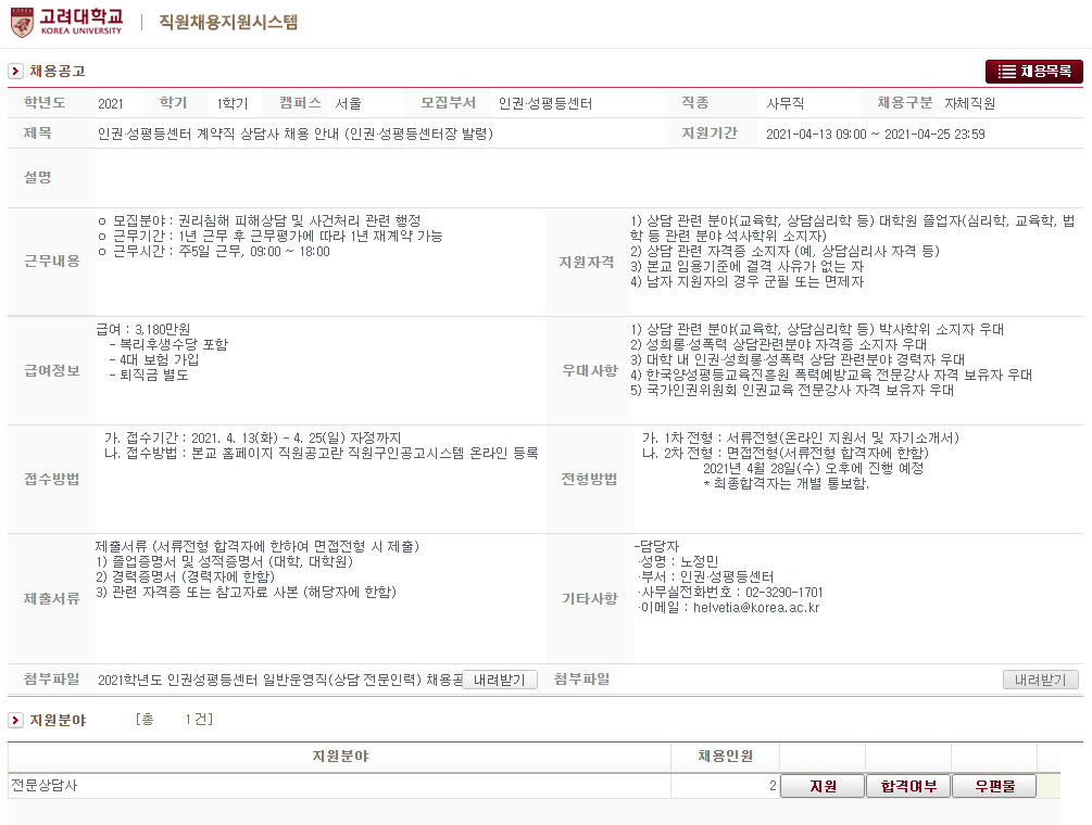 | 고려대학교 인권.성평등센터 계약직 (0) | 2021.04.22 |